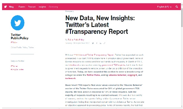 वहीं भारत सरकार के इलेक्ट्रॉनिक्स और सूचना प्रौद्योगिकी मंत्रालय ने सूचना प्रौद्योगिकी अधिनियम, 2000 की धारा 69ए के तहत 261 खातों की जानकारी मांगी थी और 102 खातों को बंद करने का अनुरोध भी भेजा था। जोकि गत वर्ष की समान अवधि के मुकाबले 55 फीसदी अधिक है। हालांकि सरकार, पुलिस और अदालत के अनुरोध के बाद भी किसी भी खाते और किसी भी ट्वीट को नहीं हटाया गया।