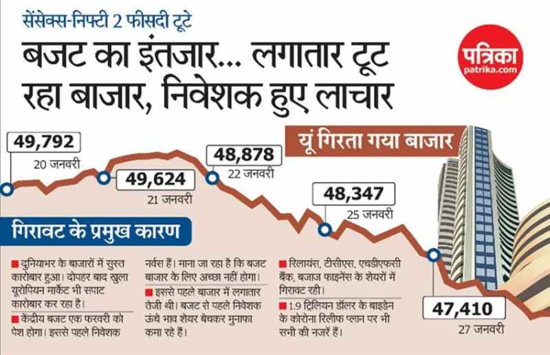 बाजार की इस गिरावट के पीछे दो प्रमुख कारण हैं। एक तो यह कि ज्यादा बढ़ चुके बाजार में अब बजट से पहले कमाई हो रही है। दूसरी बात इस गिरावट से ऐसी उम्मीद है कि बजट में बाजार या इससे जुड़े सेक्टर के लिए कोई अच्छी घोषणा होनी मुश्किल है। साथ ही सरकार कई तरह के नए टैक्स लगा सकती है। इसलिए निवेशक इस समय बाजार में पूरी सतर्कता के साथ कारोबार कर रहे हैं।