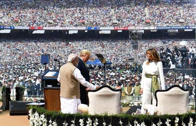 मोटेरा स्टेडियम में भाषण देने जाते पीएम मोदी, अमरीकी राष्ट्रपति डोनाल्ड ट्रंप और फर्स्ट लेडी मेलानिया ट्रंप