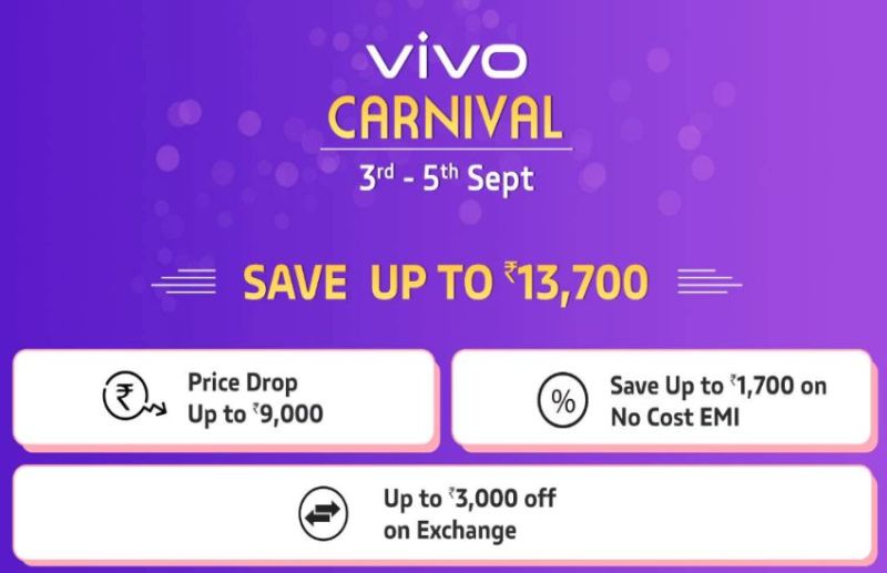 नई दिल्ली: वीवो ने आज से Amazon पर Vivo Carnival Sale शुरू कर दिया है। कंपनी ने इस सेल का आयोजन Flipkart पर भी किया गया है। Amazon पर ये सेल 5 सितंबर तक चलेगी। तीन दिनों की इस सेल के दौरान Vivo अपने कुछ स्मार्टफोन को डिस्काउंट, एक्सचेंज ऑफर और No-Cost EMI जैसे ऑफर्स के साथ बेचा जा रहा है।