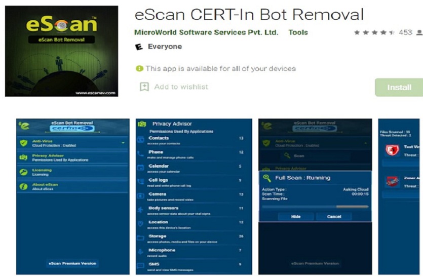 eScan CERT-In Bot Removal एप को आप गूगल प्ले-स्टोर से फ्री में डाउनलोड कर सकते हैं। यह एप आपको किसी गलत और स्पैम वाली साइट पर जाने से रोकेगा। इसके अलावा यह एप आपके फोन को स्कैन करके बता सकता है कि आपके फोन में वायरस या मैलवेर हैं या नहीं। यदि आपको भी इस बात का संदेह है कि आपके फोन में वायरस या मैलवेयर हो सकते हैं तो eScan CERT-In Bot Removal या ‘M-Kavach 2’ एप को अपने फोन में डाउनलोड करें।