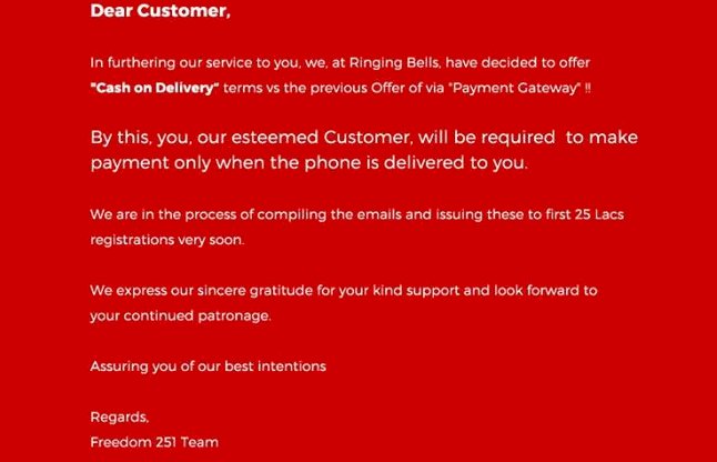 रिंगिंग बेल्स ने अपने फेसबुक पेज पर जानकारी दी है कि अब फ्रीडम 251 बुक करने वाले यूजर्स को मोबाइल की डिलिवरी घर पर आने पर भुगतान करना होगा। हालांकि यह ऑफर उन्ही 25 लाख ग्राहकों के लिए है जिन्होंने सबसे पहले फोन के लिए रजिस्टर किया था।
