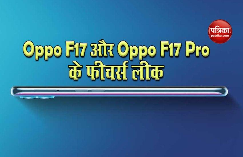 Oppo F17 Pro में 6.43 इंच की Super AMOLED डिस्प्ले मौजूद है। इसमें स्पीड के लिए MediaTek Helio P95 चिपसेट का इस्तेमाल होगा और इसे 8 GB रैम के साथ पेश किया जाएगा। इस फोन में भी पावर के लिए 4000एमएएच की दमदार बैटरी मिलेगी, जो 30W फ्लैश चार्ज को सपॉर्ट करेगी। फोटोग्राफी के लिए Oppo F17 Pro के रियर में भी चार कैमरा होगा। इसमें पहला 48 मेगापिक्सल, दूसरा 8 मेगापिक्सल, तीसरा 2 मेगापिक्सल और चौथा 2 मेगापिक्सल का कैमरा हो सकता है। इसमें ड्यूल सेल्फी कैमरा सेटअप होगा, जो 16 मेगापिक्सल और 8 मेगापिक्सल के साथ आएगा। Oppo F17 Pro को मैट ब्लैक, मैजिक ब्लू और मटैलिक वाइट कलर में पेश किया जा सकता है।