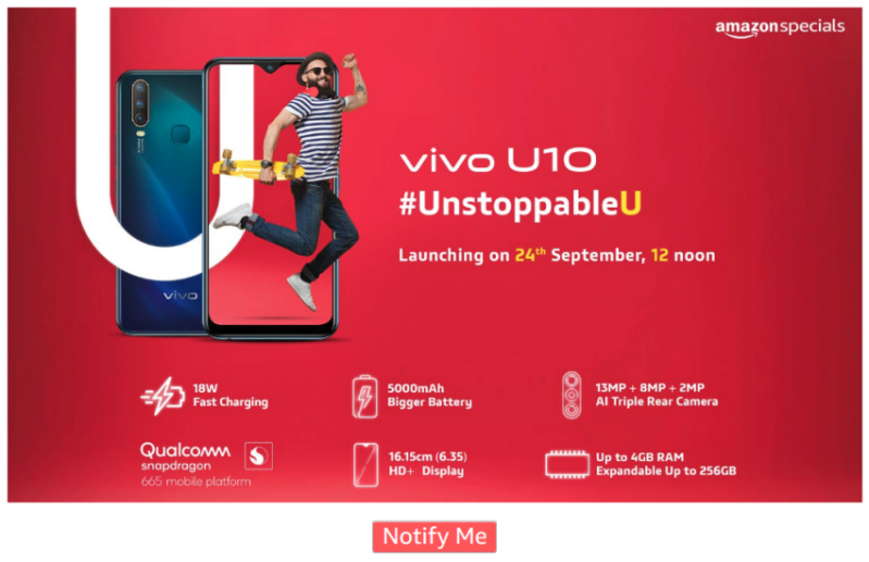 नई दिल्ली: चीनी कंपनी वीवो ( Vivo ) अपने नए U सीरीज को भारत में लॉन्च करने के लिए पुरी तरह से तैयार है। इस सीरीज के पहले स्मार्टफोन Vivo U10 को आज दोपहर 12 बजे भारत में लॉन्च किया जाएगा। इसके लिए कंपनी ने नई दिल्ली में एक ईवेंट का आयोजन रखा है। Vivo U10 का लैंडिंग पेज पहले ही ऑनलाइन शॉपिंग साइट अमेजन ( Amazon.in ) पर बनाया जा चुका है जिसके इसके कई स्पेसिफिकेशंस जानकारी सामने आ चुकी है। इस स्मार्टफोन को ई-कॉमर्स साइट अमेजन ( Amazon ) और कंपनी ऑनलाइन साइट पर बेचा जाएगा।