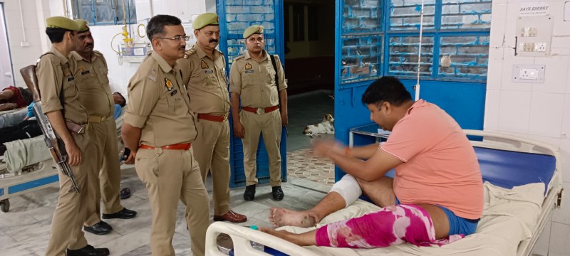 जिला अस्पताल पहुंच कर घायल अखिलेश शर्मा से पूछताछ करते हुए एसपी सिटी