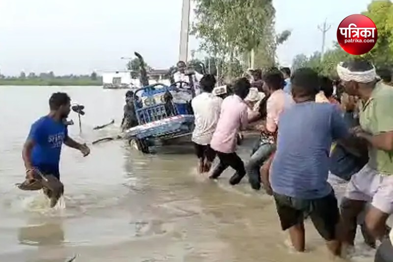 बाढ़ के पानी में फंसे ट्रैक्टर को निकालने की जद्दोजहद करते स्थानीय लोग