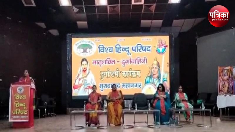 Moradabad News In Hindi: विश्व हिंदू परिषद के दुर्गा वाहिनी कार्यक्रम में आगरा से आईं विश्व हिंदू परिषद की नेता रीना शर्मा ने हिंदू समुदाय की महिलाओं को शपथ दिलाई कि वह किसी भी त्योहार पर मुस्लिम समुदाय के लोगों से मेहंदी नहीं लगवाएंगी। ना ही उनके हाथों से कोई गहना पहनेगी।