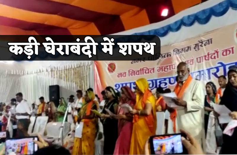 मुरैना. नगर निगम की महापौर शारदा सोलंकी और सभी पार्षदों ने मंगलवार को टॉउनहॉल में कड़ी सुरक्षा व्यवस्था के बीच आयोजित समारोह में शपथ ग्रहण कर ली। कांग्रेस और भाजपा अपने समर्थक पार्षदों को कड़ी सुरक्षा व्यवस्था के बीच शपथ समारोह स्थल पर लेकर पहुंचे। शपथ होते ही कांग्रेस के पार्षद प्रमुख नेताओं और कार्यकर्ताओं के साए में अंबाह रोड स्थित कृष्णा मैरिज गार्डन के लिए रवाना हो गए। वहां से उन सभी को अज्ञातवास पर भेज दिया गया है। अब वे पांच अगस्त को सुबह सभापति के चुनाव के समय ही लौटेंगे।
