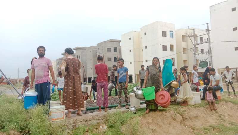 -पीएम आवास पानी के लिए भटकते लोग।
