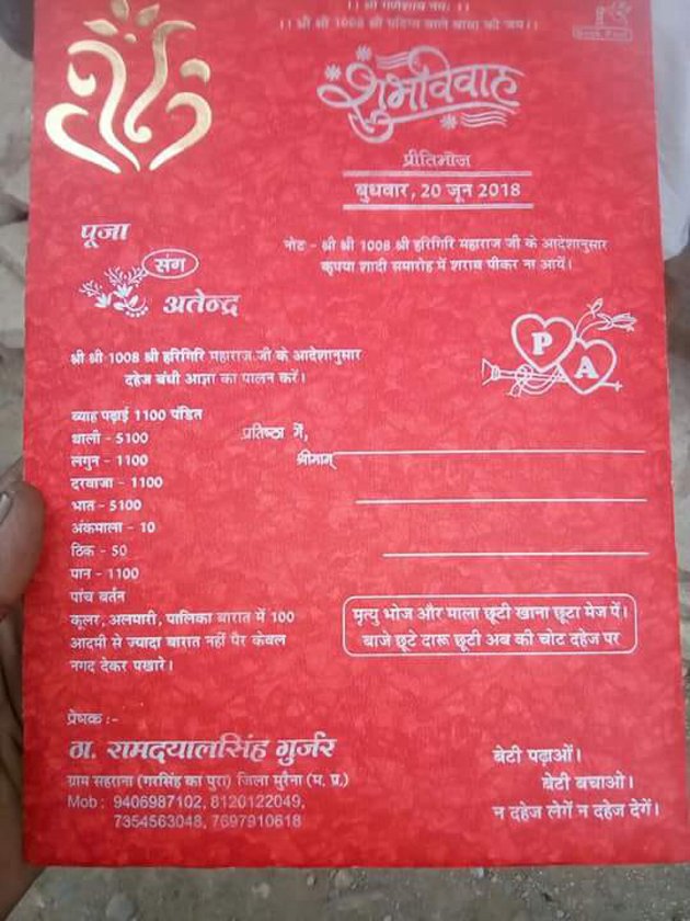 सरहाना पंचायत के गरसिंह का पुरा निवासी रामदयाल सिंह गुर्जर की बेटी पूजा की शादी 20 जून को है। जिसके लिए रामदयाल सिंह ने रिश्तेदारों के लिए कार्ड छपवाए है, लेकिन यह कार्ड कई मायने में अन्य कार्डों से अलग है। इस कार्ड पर खादी के खर्च का पूरा ब्यौरा दिया गया है, जिसमें ब्याह पढऩे के पंडित की दक्षिणा 1100 रुपए, थाली की रस्म 5100, लगुन 1100 रुपए, दरवाजा 1100 रुपए, भात 5100 रुपए, अंकमाला 10 रुपए, ठिक 50 रुपए, पान 1100 रुपए सहित पांच बर्तन, कूलर, अलमारी, बेड देंगे। इसके साथ ही बारात में महज 100 लोगों ही आमंत्रित किए गए हैं। महज यही नहीं शादी के इस खर्च के ब्यौरे के साथ कार्ड पर दहेज बंदी व समाज सुधार से जुड़े स्लोगन जैसे 'मृत्यु भोज और माला छूटी, खाना छूटा मेज पे, बाजे छूटे, दारू छूटी अब की चोट दहेज परÓ लिखा गया है साथ ही बेटी पढ़ाओ, बेटी बचाओ, न दहेज लेंगे न दहेज देंगे लिखा गया है। वहीं शादी में शामिल होने वाले लोगों से संत हरिगिरी महाराज के आदेशानुसार शराब पीकर शामिल न होने की अपील भी की गई है। संत हरिगिरी ने शुक्रवार को ही करह आश्रम पर महापंचायत आयोजित की थी, जिसमें गुर्जर समाज के लिए शादी में खर्च तय किया गया और दहेज पर पूरी तरह प्रतिबंध लगा दिया गया।