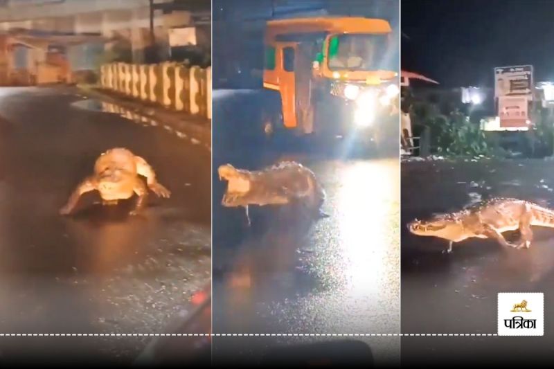 पूरे राज्य में मॉनसून की दस्तक के बाद से बारिश हो रही है। इससे भीषण गर्मी से परेशान लोगों को राहत मिली है। लेकिन बारिश होते ही जमीन के भीतर रहने वाले कई जानवर रहवासी इलाकों में देखे जा रहे हैं। इस बीच एक हैरान कर देने वाला वीडियो सामने आया है, जिसमें एक विशालकाय मगरमच्छ चिपलून शहर की व्यस्त सड़क पर रात में बड़े आराम से चलता दिख रहा है। इस दौरान वाहन से गुजर रहे कुछ लोग मगरमच्छ का वीडियो बना लेते हैं। यह वीडियो इंटरनेट पर तेजी से वायरल हो रहा है।