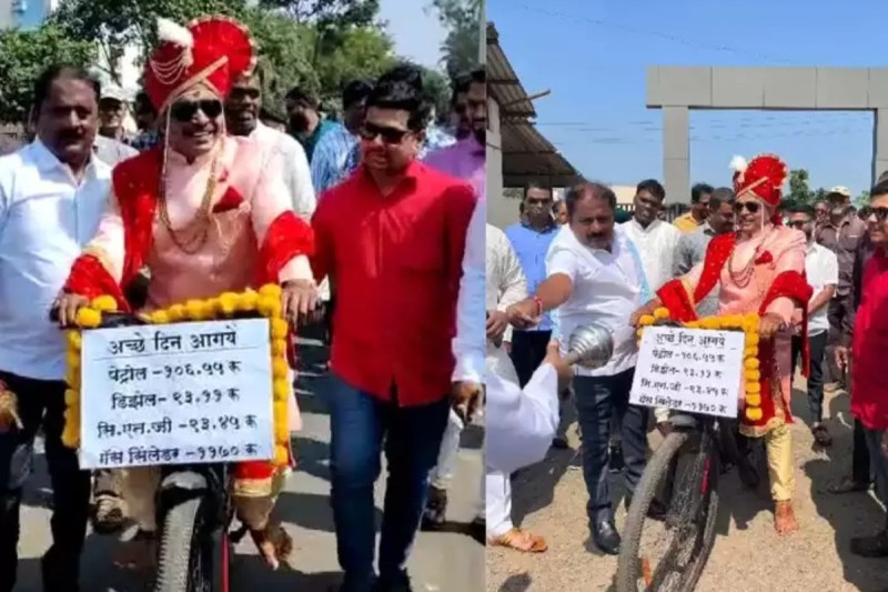 बढ़ती महंगाई के चलते आज हर आम नागरिक परेशान है। जिसको लेकर अलग-अलग जगहों पर विरोध प्रदर्शन भी किए जा रहे हैं। हालांकि, कोल्हापुर के डांगे गली में रहने वाले सामाजिक कार्यकर्ता प्रवीण डांगे ने सीधे साइकिल से ही अपनी शादी की बारात निकाली और एक अनोखे ढंग से बढ़ती महंगाई के प्रति अपना विरोध किया। फिलहाल प्रवीण डांगे के इस अनोखे अंदाज की पूरे जिले में चर्चा है। यह भी पढ़े: Maharashtra News: बचपन में रोटी के लिए किया संघर्ष, खाने में खाते थे महुआ के फूल; अब बने अमेरिका में साइंटिस्ट