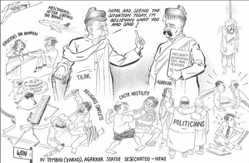 लोकमान्य तिलक चाहते थे कि पहले देश को स्वतंत्रता मिले, फिर सामाजिक सुधार। अगरकर पहले सुधार और फिर स्वतंत्रता चाहते थे। इस समाज सुधारक ने अब एक सदी पूरी कर ली है। राज ठाकरे ने भाजपा सरकार पर निशाना साधते हुए अपने नए कार्टून में तर्क दिया है कि अगर यह सदी तिलक थी, तो इसे अगरकर के विचारों का समर्थन करना होगा। राज ठाकरे ने कार्टून में देश के सामने आने वाली विभिन्न समस्याओं के माध्यम से मोदी सरकार की आलोचना की। उनके कार्टून में प्रधानमंत्री नरेंद्र मोदी और भाजपा अध्यक्ष अमित शाह भी हैं।