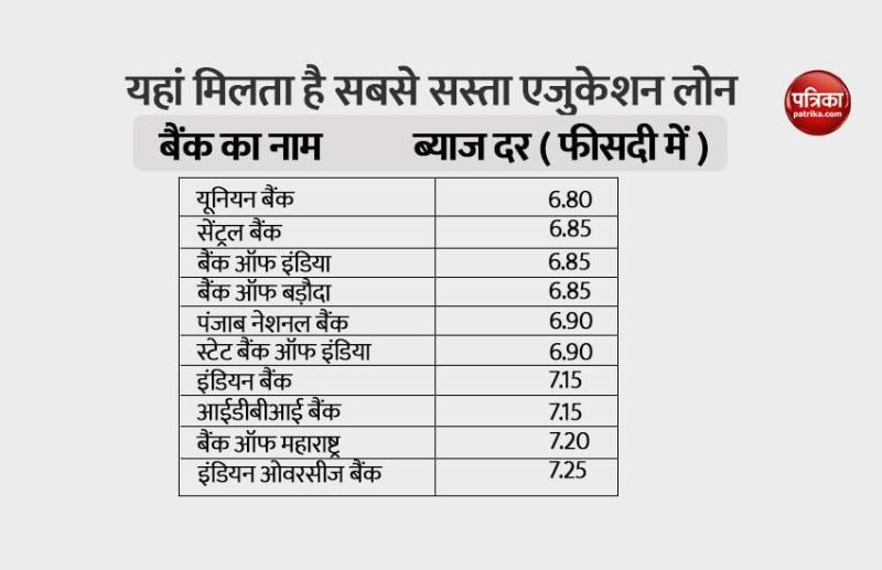सार्वजनिक क्षेत्र का बैंक प्रमुख यूनियन बैंक ऑफ इंडिया वर्तमान में एजुकेशन लोन में सबसे कम ब्याज दर प्रदान करता है, जो कि सात साल के टेन्योर के साथ 20 लाख रुपए के लोन के लिए 6.8 फीसदी से शुरू होता है। ऋण एग्रीगेटर फर्म बैंकबाजार के आंकड़ों के अनुसार, एजुकेशन लोन पर सबसे सस्ती ब्याज दरों की पेशकश करने वाले लेंडर्स की लिस्ट में 9 अन्य बैंक भी शामिल हैं।