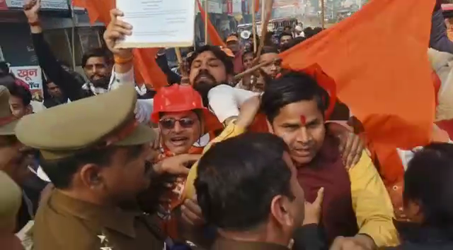 मुजफ्फरनगर। जनपद में नागरिकता संशोधन कानून (CAA) के समर्थन में कांग्रेस (Congress) की सहयोगी पार्टी ने पद यात्रा निकाली। सोमवार को सैकड़ों शिवसेना (Shivsena) कार्यकर्ताओं ने नगर में जनजागरण पद यात्रा निकाली। पद यात्रा को जिला प्रशासन की अनुमति नहीं होने के कारण उसे जबरन रुकवा दिया गया। इसके बाद शिवसेना कार्यकर्ताओं और पुलिस के बीच जमकर धक्का-मुक्की भी हुई।