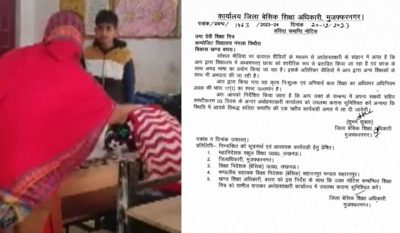 जिस समय महिला शिक्षामित्र पांचवीं की छात्रा को पीट रही थी। उसी समय विद्यालय की ही एक दूसरी महिला कर्मचारी ने इसका वीडियो बनाया था। यह वीडियो सोशल मीडिया पर वायरल हो गया। इसके बाद शिक्षा विभाग के अधिकारियों के संज्ञान में मामला आया। इसके बाद बीएसए ने मामले में तत्काल एक्शन लेते हुए महिला शिक्षामित्र के खिलाफ नोटिस जारी कर दिया। ध्यान रहे, इससे पहले भी मुजफ्फरनगर की महिला टीचर ने छात्र को टॉर्चर किया था। इसका वीडियो भी सोशल मीडिया पर वायरल हो गया था। इसमें शिक्षिका ने बच्चे को उसके सहपाठियों से थप्पड़ मरवाए थे। उस टीचर के खिलाफ शिक्षा विभाग ने एक्शन भी लिया था। साथ ही स्कूल को भी उस समय सील कर दिया गया था।