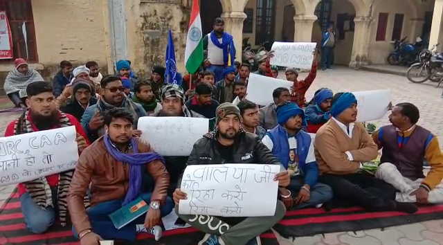मुजफ्फरनगर। नागरिकता संशोधन कानून (CAA) और एनआरसी (NRC) के विरोध में भीम आर्मी (Bhim Army) के पदाधिकारियों और कार्यकर्ताओं ने गुरुवार को धरना-प्रदर्शन किया। डीएम (DM) ऑफिस पर प्रदर्शन के दौरान भारतीय किसान यूनियन (BKU) अंबावत के पदाधिकारियों ने भीम आर्मी को समर्थन दिया। प्रदर्शन के दौरान हिंदू-मुस्लिम एकता के नारे लगाए गए।