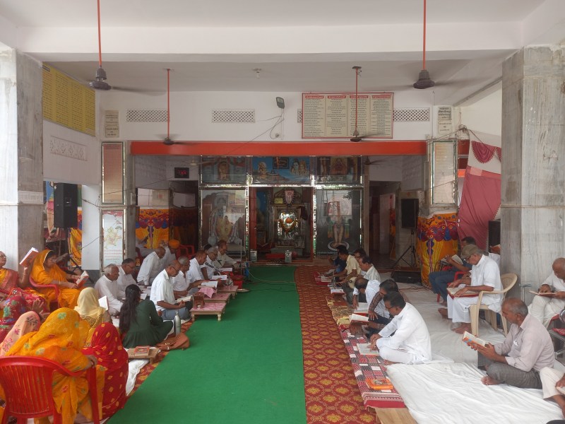 नागौर. नया दरवाजा स्थित हनुमान मंदिर गुरुवार को दोपहर रामायणमय बना रहा। अयोध्याकाण्ड का पाठ करते हुए श्रद्धालुओं के गंूजते स्वरों से पूरा माहौल बदला नजर आया। संगीत पाठ के कारण पूरा मंदिर परिसर भरा नजर आया। मानस सत्संग परिवार की ओर से अयोध्याकाण्ड के दोहे, छंद एवं चौपाइयों का पाठ किया गया। इसमें कैकेयी संवाद, कैकेयी का कोप भवन में जाना, राम-सीता और लक्ष्मण को चौदह वर्ष वनवास, केवट का अद्भुत प्रेम और सीता-राम को गंगा पार पहुचाने आदि प्रसंगों के पाठ भावप्रवण रहे। इसके पश्चात रामायण की आरती व हनुमान चालीस का पाठ किया गया। इस दौरान नेमीचंद मित्तल, सुरेश विश्नोई, गजेंद्र गौर, जय प्रकाश पित्ती, छोटमल जांगिड, सुखदेव चौधरी , जगराम चौधरी, गणपत राम, शंकरलाल चतुर्वेदी, हीरालाल सोनी आदि सामूहिक पाठ में शामिल थे। शाम को ही रामलीला में राम वन गमन एवं दशरथ निधन का प्रसंग मंचित किया गया। रामलीला में विवाह के बाद अयोध्या पहुंचे श्रीराम का राज्याभिषेक करने के दौरान कैकयी कोप भवन में जाना, और दशरथ का उनको समझाना, इसके बाद भी कैकयी की जिद पर आखिरकार भगवान श्रीराम व लक्ष्मण वल्कल वेश में सीता एवं लक्ष्मण के साथ रवाना हुए और प्रजा इनके पीछे चलने सरीखे दृश्य काफी भावप्रवण नजर आए। इधर अयोध्या से निकलते ही पिता दशरथ मुक्र्षित हो गए, और राम-राम कहते हुए उनके प्राण निकल गए। इन दृश्यों को देख रहे श्रद्धालुओं की आंखें भी नम नजर आई। वल्कल वेश में राम, सीता व लक्ष्मण का वन गमन करना व दशरथ के प्राण त्यागने सरीखे दृश्यों से पूरा मंचन स्थल रामायण कालीन युग में बदला सा नजर आया। भगवान श्रीराम का प्रजा को समझाने का दृश्य श्रद्धालुओं को नसीहतें देने के साथ ही उनकेा झकझोर गया।