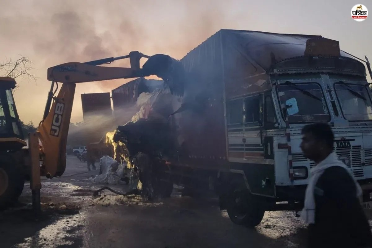 नागौर। सोमवार शाम नागौर-लाडनूं राष्ट्रीय राजमार्ग पर डेह बायपास के पास उस वक्त अफरा-तफरी मच गई जब रुई से भरे एक कंटेनर में अचानक आग भड़क उठी। देखते ही देखते आग पूरे कंटेनर में फैल गई और मौके पर धुएं का गुबार छा गया। आग बुझाने के लिए कंटेनर को जेसीबी से तोड़ना पड़ा। हालांकि चालक की सूझबूझ से बड़ा हादसा टल गया और कोई जनहानि नहीं हुई।