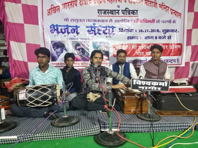 नागौर. दधिमति माताजी मंदिर प्रन्यास व राजस्थान पत्रिका के संयुक्त तत्वावधान में शुक्रवार को गोठ मांगलोद स्थित दधिमाता मंदिर में अन्नकूट व दीपोत्सव के उपलक्ष्य में आयोजित भक्ति संध्या में श्रद्धालु भाव विभोर होकर झूम उठे। राजस्थान पत्रिका ‘स्वर-साधना’ के कलाकार व सुरों के सिकंदर के फाइनल राउण्ड में पहुंचे नागौर के सम्पत दाधीच ने अन्तरमन की गहराइयों से जब मां की आराधना में स्वरों को साधा तो उपस्थित श्रद्धालु भक्तिभाव में झूम उठे। दाधीच ने भगवती वंदना, मन की मुरादें पूरी कर मां, तूं कितनी अच्छी है, ऐसी लागी लगन मीरां हो गई मगन जैसे एक से बढकऱ एक भजन प्रस्तुत कर श्रोताओं को मंत्रमुग्ध कर दिया। भक्तों ने आकण्ठ भक्ति में डूबे माहौल का जमकर आनंद लिया। युवा कलाकार मुन्ना स्वर्णकार ने भजन मैयाजी थारा कस के पकड़ लिया पांव सुनाया। इसके बाद श्रोताओं की अलग-अलग फरमाइश पर उन्होंने मां के दरबार में अलग-अलग रंग में हाजरी लगाई। इस दौरान नरेन्द्र पारीक ने तूं सुनादे फिर से बंशी की ताना..., मैं म्हारी मां का लाडला म्हानै राखीजै संभाल... सरीखे के भजनों से मां की अरदास की। भक्ति संध्या में ऑर्गन पर शिव रासीसर, तबले पर राकेश गोरमात, ऑक्टोपेड पर मुकेश गोरमात तथा प्रेम देशनोक संगत करेंगे।