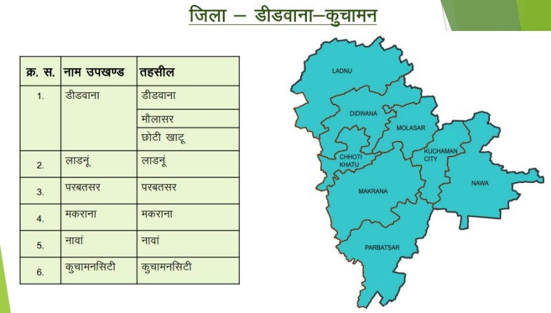 - डीडवाना-कुचामन जिले में डीडवाना, लाडनूं, परबतसर, मकराना, नावां और कुचामन सिटी छह उपखंड हाेंगे। वहीं डीडवाना, मौलासर, छोटी खाटू, लाडनूं, परबतसर, मकराना, नावां और कुचामन सिटी आठ तहसीलें होंगी।- नागौर जिले में नागौर, खींवसर, मूण्डवा, मेड़ता सिटी, डेगाना, जायल व रियांबड़ी सात उपखंड हाेंगे। नागौर, खींवसर, मूण्डवा, मेड़ता, डेगाना, रियांबड़ी, जायल, सांजू व डेह 9 तहसीलें होंगी।