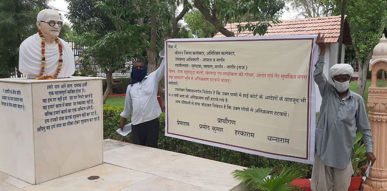 साडोकन के हरकाराम व खुडख़ुड़ा के प्रेमाराम पिछले कई वर्षों से सरकारी भूमि को अतिक्रमण मुक्त कराने की लड़ाई लड़ रहे हैं। हर महीने नागौर पहुंचकर जिला कलक्टर को ज्ञापन देते हैं, लेकिन कार्रवाई नहीं होने पर दोनों ने गांधीजी के समक्ष अपनी मांग रखी। गुरुवार को दोनों ने एक बैनर छपवाकर गांधीजी की प्रतिमा के सामने खड़े होकर सहयोग की अपील की।