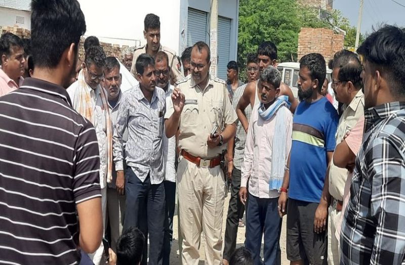 कुचामनसिटी. ग्राम मीठड़ी में विवाहिता की मौत होने के बाद विरोध प्रदर्शन कर रहे पीहर पक्ष से समझाइश करती पुलिस।