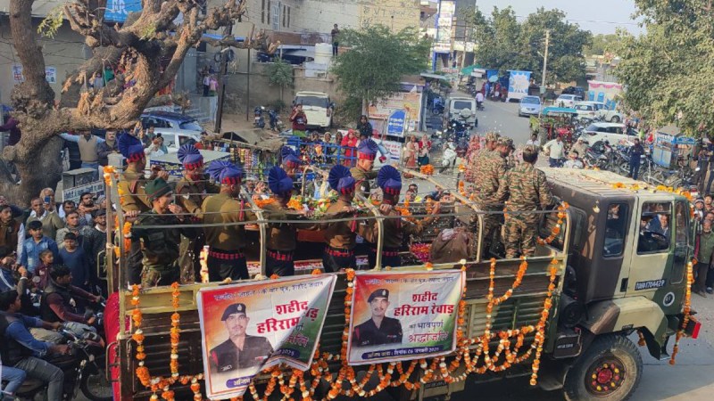 जायल (नागौर)। जम्मू-कश्मीर के बांदीपोरा में सड़क दुर्घटना में शहीद हुए नागौर जिले की जायल तहसील के गांव राजोद निवासी हरिराम रेवाड़ का पार्थिव शरीर सोमवार शाम को पैतृक गांव पहुंचा। यहां सैन्य सम्मान के साथ अंत्येष्टि की गई। सेना के जवानों ने गार्ड ऑफ ऑनर दिया। शहीद के 11 वर्षीय पुत्र नवीन ने चिता को मुखाग्नि दी। हरिराम 13 राष्ट्रीय राइफल्स में हवलदार थे। वे 4 जनवरी को जम्मू कश्मीर के बांदीपोरा में सड़क दुर्घटना में शहीद हो गए थे।