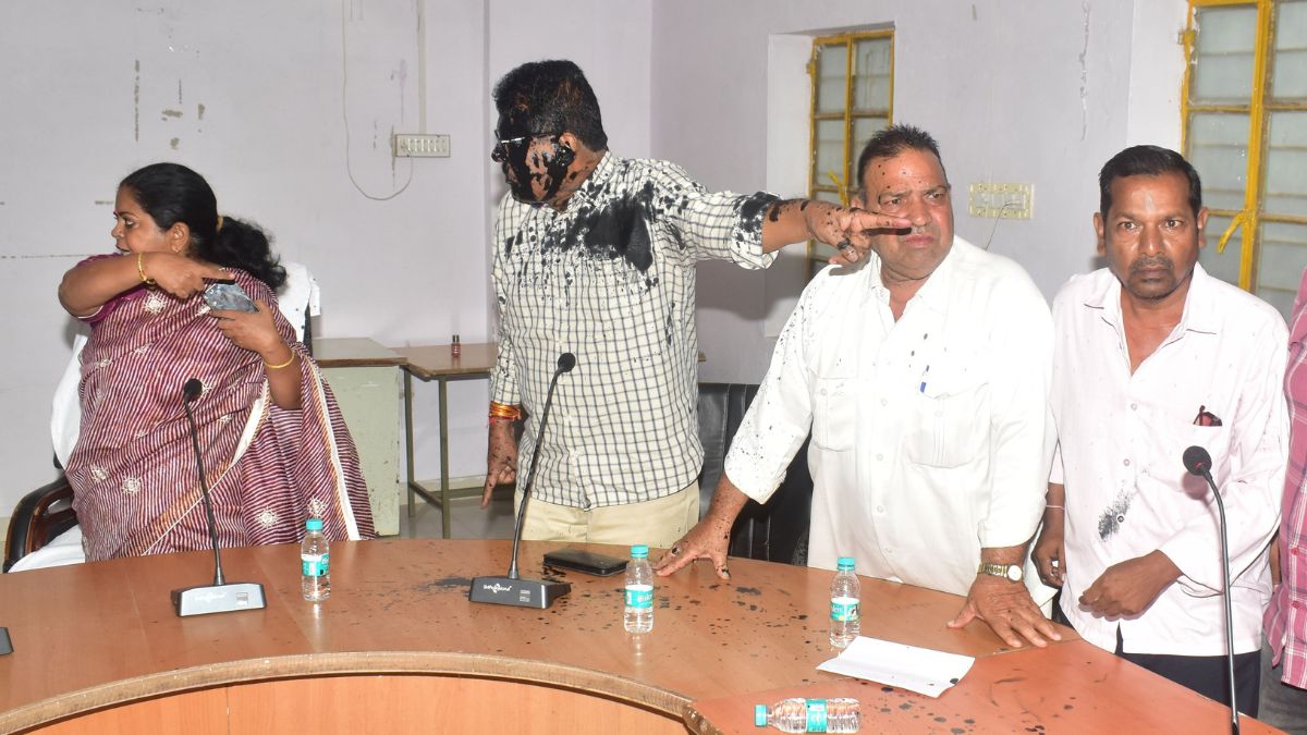 नागौर नगर परिषद की साधारण सभा में पार्षद के चेहरे पर फेंकी गई काली स्याही। फोटो पत्रिका