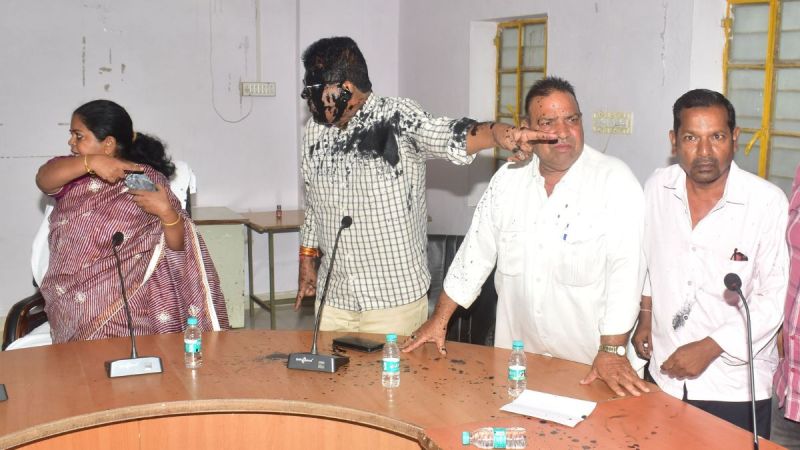 पार्षद टांक से उनकी गर्मागर्म बहस होने लगी। इस बीच आक्रोश में आकर भरत टांक ने नवरतन बोथरा के चेहरे पर काली स्याही फेंक दी। इस घटना के बाद हंगामा बढ़ने पर मौके पर मौजूद दूसरे पार्षदों व आयुक्त ने बीच बचाव कर मामला शांत कराया। बाद में सभापति ने बैठक समाप्ति की घोषणा कर दी। सभापति मीतू बोथरा ने पार्षद की ओर से की गई इस हरकत को अशोभनीय व शर्मनाक बताया। पार्षद नवरतन ने कहा कि पार्षदों के इस्तीफे स्वीकार हो चुके हैं और मामला हाईकोर्ट में विचाराधीन है।