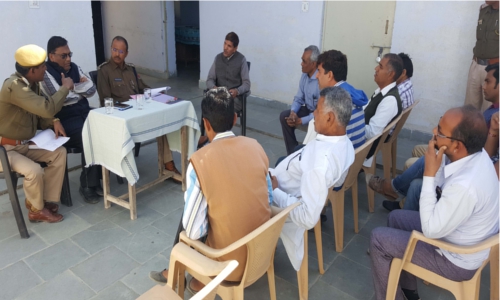 रियांबड़ी में चोरी की घटना का खुलासा करने को लेकर आयोजित बैठक में चर्चा करते उपखंड अधिकारी, पुलिस उप अधीक्षक व व्यापारी।