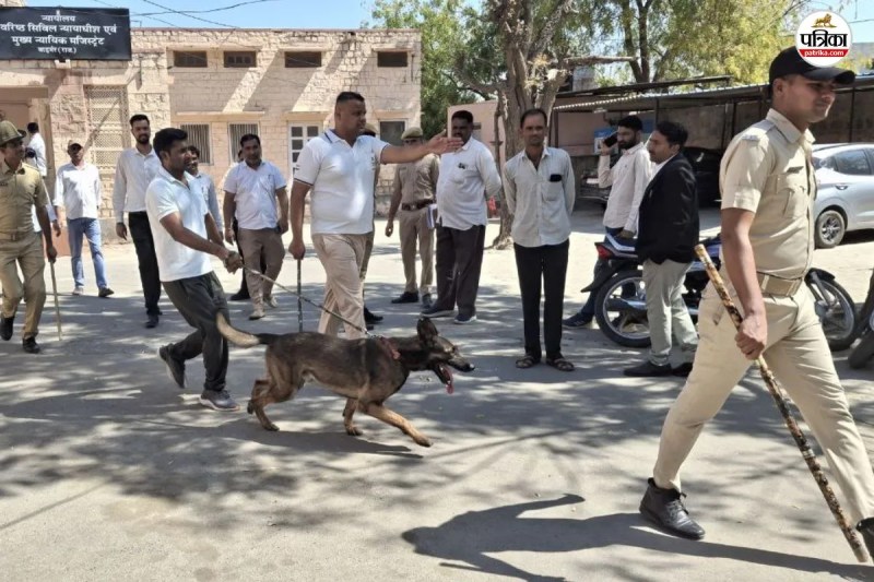 बाड़मेर के कोर्ट परिसर में तलाशी अभियान में जुटे पुलिसकर्मी। फोटो: पत्रिका