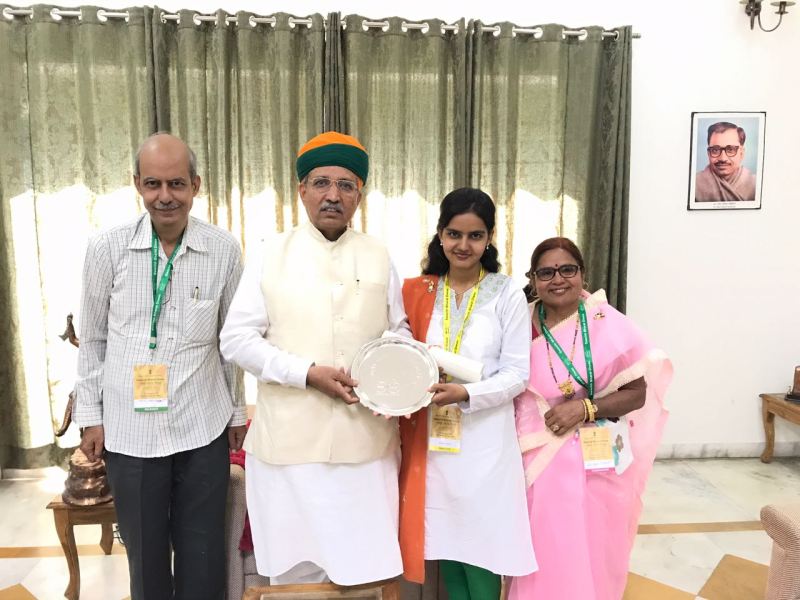 Renuka Purohit and her parents with Union minister Arjun Ram Meghwal in delhi after receiving award