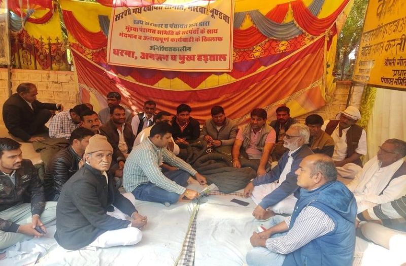 मूण्डवा में धरना स्थल पर सरपंचों से वार्ता करते पूर्व विधायक व पूर्व पालिका अध्यक्ष।