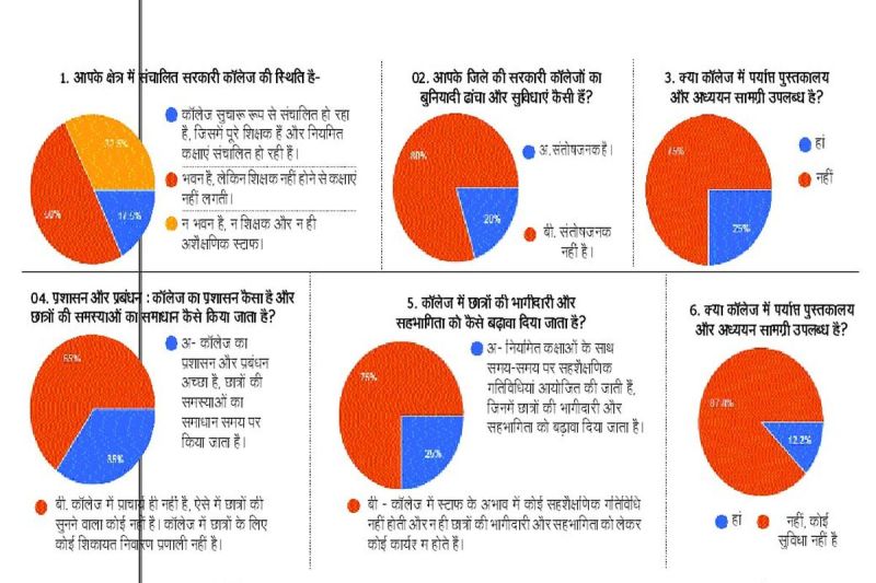 सरकारी कॉलेजों की स्थिति को सुधारने के लिए क्या प्रयास होने चाहिए, इसको लेकर भी एक सवाल सर्वे में शामिल किया, जिसके जवाब में 16 युवाओं ने कहा कि सबसे पहले शिक्षकों के पद भरने चाहिए, ताकि शिक्षण व्यवस्था सुचारू हो सके। इसके अलावा दो विकल्प सरकारी कॉलेजों के भवन बनाने के लिए अन्य सुविधाओं को बढ़ाना चाहिए, ताकि छात्रों को निजी कॉलेजों में प्रवेश नहीं लेना पड़े तथा नई शिक्षा नीति को सही ढंग से लागू करने के लिए कॉलेजों में सभी पद भरने चाहिए तथा समय पर पाठ्यक्रम पूरा करवाने के साथ परीक्षाएं भी समय पर होनी चाहिए, को शामिल किया गया, जो क्रमश: 2.3 एवं 7 प्रतिशत का जवाब रहा। जबकि 74.4 प्रतिशत ने इन सभी सुविधाओं को विकसित करने की बात कही।