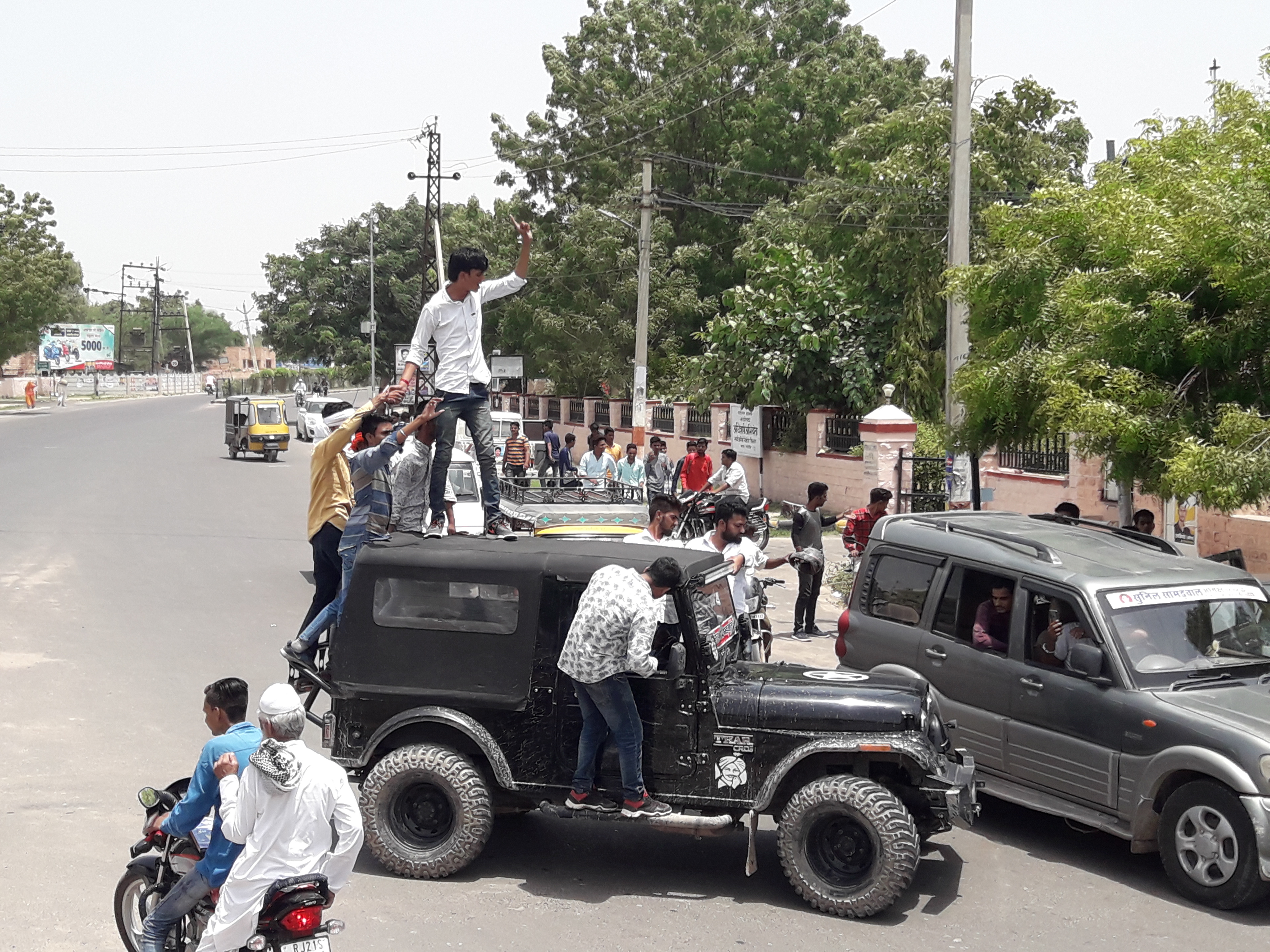 नागौर. एनएसयूआई की जिला स्तरीय बैठक बुधवार को जिला कांग्रेस कार्यालय में बुधवार को सुबह 11 हुई। लेकिन बैठक से पहले छात्रसंघ उम्मीदवार के समर्थक बड़ी संख्या में गाडिय़ों में सवार होकर नारे बाजी करते हुए कांग्रेस कार्यालय पहुंचे और सड़क पर वाहन खड़े करके कार्यालय में अंदर रवाना हो गए। इससे सड़क पर जाम लग गया। पूरे रास्ते लग्जरी गाडिय़ों की छतों पर खड़े होकर कार्यकर्ता अपने प्रत्याशियों के समर्थन में नारेबाजी कर रहे थे। इस दौरान केवल दो ही पुलिसकर्मी कार्यालय में दिखाई दिए। पुलिस के आला अधिकारियों को इस संबंध में सूचना देने पर कोतवाली से पुलिस जाप्ता सहित आरएसी के जवान मौके पर पहुंचे। वाहनों को एक तरफ करवाकर जाम खुलवाया।