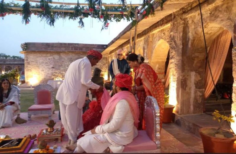 खींवसर/खजवाना(नागौर). राजस्थानी परम्पराओं के बीच गुरुवार को खींवसर रिसोर्ट में केन्द्रीय मंत्री स्मृति ईरानी की बेटी शैनेल ईरानी व एनआरआई अर्जुन भल्ला परिणय सूत्र में बंधे। इस शाही शादी को लेकर खींवसर फोर्ट को फूलों से सजाया गया, वहीं खींवसर ड्यून्स रोशनी से जगमगाते नजर आए। शादी में बेहद करीबी दोस्तों व रिश्तेदारों सहित 50 से भी कम मेहमान शामिल हुए ।इस दौरान सुरक्षा के कड़े बन्दोबस्त किए गए। आमंत्रित मेहमानों के अलावा किले में जाने पर पूर्ण पाबंदी थी।