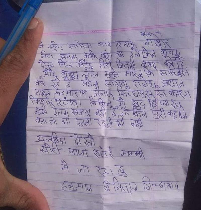 आत्महत्या करने से पहले सुरेन्द्र ने सोशल मीडिया फेसबुक पर सुसाइड नोट डाला और इसके बाद छोटी खाटू के पास ट्रेन के आगे कूदकर सुसाइड कर लिया। सुसाइड नोट में कुछ लोगों पर उसे परेशान करने एवं मारने की साजिश का भी आरोप लगाया है। सुसाइड नोट में मृतक सुरेंद्र सांगवा ने जायल के एक जनप्रतिनिधि सहित करीब आधा दर्जन लोगों के नाम भी लिखे हैं। साथ ही यह लिखा है कि वह खुद ही जा रहा है। वहीं सुसाइड नोट के अंत में मृतक ने "हनुमान बेनीवाल जिंदाबाद" लिखा है। मृतक हनुमान बेनीवाल का समर्थक था और विधानसभा चुनाव में सोशियल मीडिया पर बेनीवाल के समर्थन में प्रचार करता था। जिन लोगों पर मृतक ने आरोप लगाया है, वे ज्यादातार एक ही परिवार के हैं और रिश्तेदार हैं।