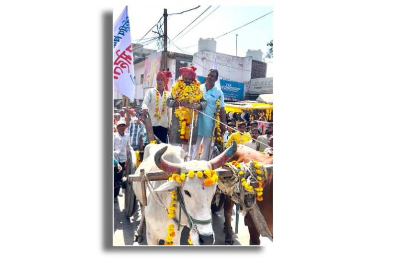 MP Election 2023 : इस तरह बैलगाड़ी से नामांकन दाखिल करने जाते लोकेन्द्र मेहता।