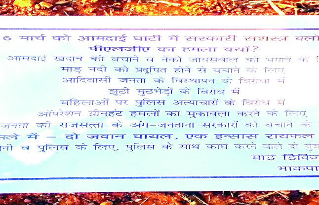 इसके साथ ही माड़ ऩदी को प्रदुषित होने से बचाने के लिए, आदिवासी जनता के विस्थापन के विरोध में झूठी मुठभेड़ों के विरोध, महिलाओं पर पुलिस अत्याचारों के विरोध, ऑपरेशन ग्रीनहंट हमलों का मुकाबला करने जनता की राजसत्ता के अंग जनताना सरकारों को बचाने के लिए आमदई घाटी में हमला करने की बात कहीं है।