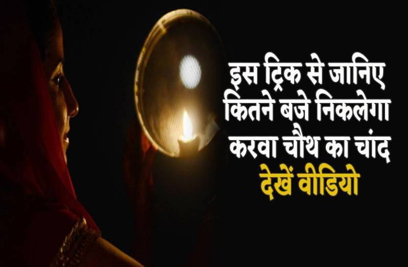 करवाचौथ पर चांद किस समय निकलेगा इस सवाल का जवाब अब खुद महिलाएं एक ट्रिक के जरिए पा सकती हैं। नेशनल अवार्ड प्राप्त विज्ञान प्रसारक सारिका घारू ने बताया कि खगोल विज्ञान की एक ट्रिक के जरिए इस बात का पता चलाया जा सकता है कि गुरुवार को करवाचौथ के दिन चांद किस वक्त पर नजर आएगा। उन्होंने बताया कि गुरुवा को चांद किस वक्त नजर आएगा इसके लिए आपको बुधवार को निकलने वाले चांद पर नजर रखनी होगी और बुधवार को जिस वक्त आपको चांद नजर आए उसमें 41 मिनिट और जोड़ दें इस तरह से जो समय आएगा वो गुरुवार को चांद के नजर आने का समय होगा। इसे कुछ इस तरह से समझिए कि अगर आपको आपके घर से चांद बुधवार को रात 7 बजकर 50 मिनट पर नजर आया तो गुरुवार को करवाचौथ का चांद 8 बजकर 31 मिनट पर नजर आएगा।