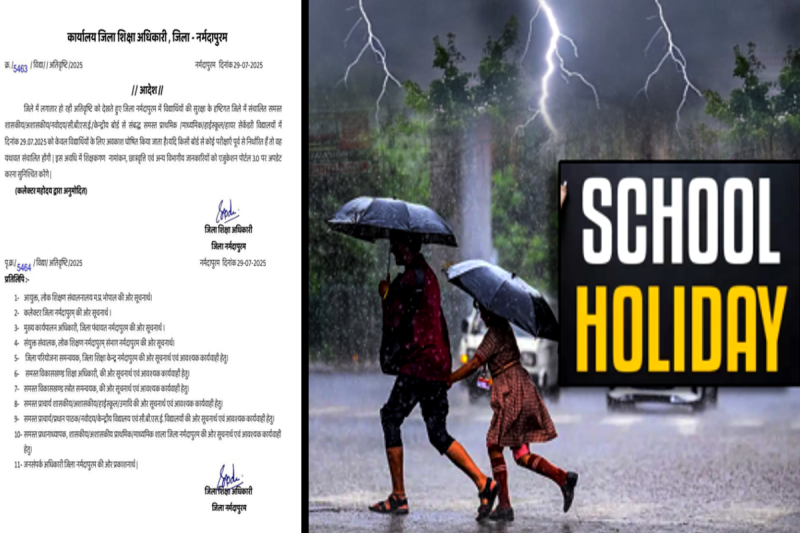 Schools Holiday Declare :मध्य प्रदेश के नर्मदापुरम जिले में भारी बारिश का दौर जारी है। निचले इलाकों में जल भराव के हालात हैं। नदी - नाले उफान पर होने के कारण कई मार्ग बंद हो चुके हैं। साथ ही, कई गांवों से संपर्क भी टूटा हुआ है। वहीं, मौसम विभाग की और से जिले में जारी भारी बारिश के अलर्ट को मद्देनजर रखते हुए शिक्षा विभाग ने आज जिले के सभी स्कूलों की छुट्टी घोषित कर दी है। इस संबंध में विभाग की ओर से आदेश जारी किया गया है।