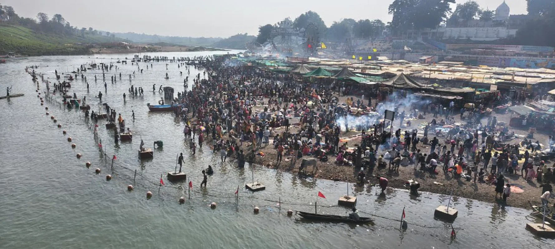 नर्मदा के रेत घाट में संक्रांति मेला भी लगा हुआ है, जिससे श्रद्धालुओं में विशेष उत्साह देखा जा रहा है