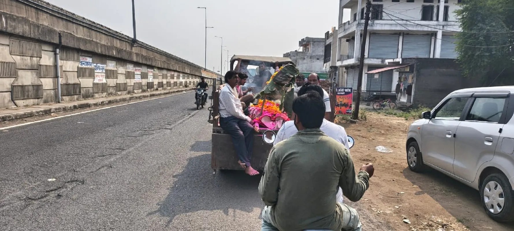 The long distance makes the funeral नरसिंहपुर. जिले में नेशनल हाइवे 44 और 45 को जोडऩे वाले राजमार्ग चौराहा क्षेत्र में आबादी और ऑलीशान भवन भले ही तेजी से बढ़ रहे हैं। दिनभर वाहनों की आवाजाही और रफ्तार दिखती है, लेकिन इसी चौराहे के किनारे बसे करीब 1200 लोगों के लिए दुख की घड़ी सबसे अधिक भारी पड़ती है। जनपद चांवरपाठा अंतर्गत ग्राम पंचायत लोलरी के इस क्षेत्र में आज तक मुक्तिधाम की व्यवस्था नहीं हो सकी है। जब किसी घर से अंतिम यात्रा निकलती है, तो शोकाकुल परिजनों को लगभग 2 किलोमीटर दूर ग्राम पंचायत लोलरी तक जाना पड़ता है। दूरी अधिक होने से शव यात्रा निकालना कठिन हो जाता है। ऐसा ही एक दुखद दिन शनिवार का रहा जब चौराहा क्षेत्र में वर्षो से रहने वाले परिवार को मुक्तिधाम की व्यवस्था न होने से शव को ट्रैक्टर-ट्रॉली में लेकर दो किमी दूर लोलरी गांव जाना पड़ा।