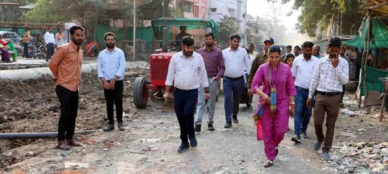 नगर में चल रहे रोड निर्माण का निरीक्षण करते हुए कलेक्टर।