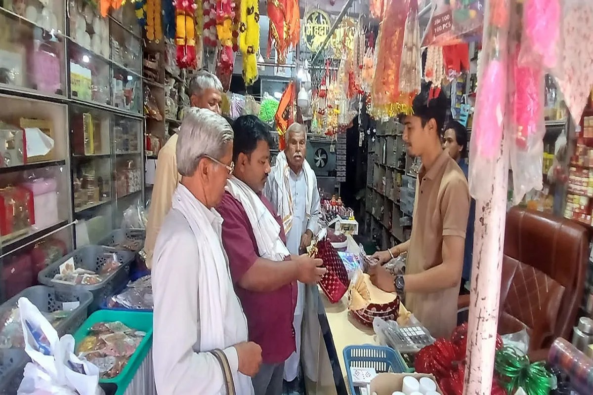 वैवाहिक आयोजन के लिए दुकान से खरीद करते ग्रामीण।