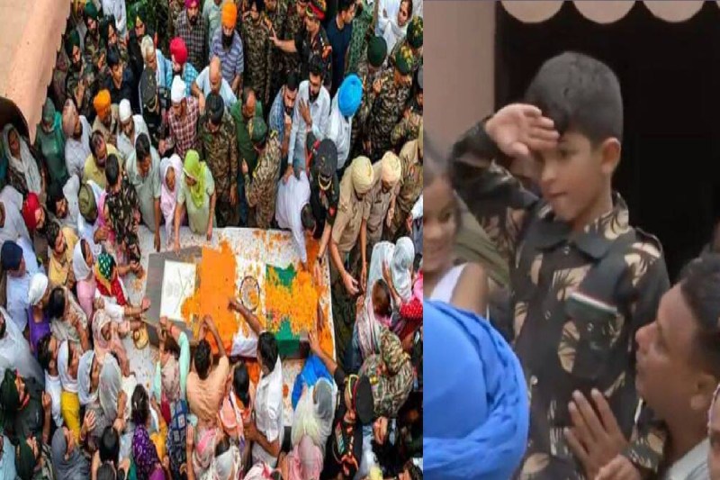 Colonel Manpreet Singh Last Rites: आतंकियों के साथ मुठभेड़ में शहीद हुए कर्नल मनप्रीत को आज शुक्रवार को मोहाली में अंतिम विदाई दी गई। आज सुबह से ही उनके आवास पर हजारों की संख्या में लोग जुट रहे थे, हर शख्स के आंख में कर्नल मनप्रीत को खोने का था। अंतिम यात्रा के दौरान जिस तस्वीर ने समूचे देश को सबसे ज्यादा भावुक किया, वह थी कर्नल मनप्रीत के मासूम बेटे की। उनके नन्हे मासूम बेटे ने फौजी वर्दी पहनकर शहीद पिता को सलाम और जय हिन्द कह अंतिम विदाई दी। इस मार्मिक दृश्य को देख हर किसी की आंखें नम हो गईं। अंतिम यात्रा में शामिल हुए लोगों ने कर्नल मनप्रीत अमर रहें के नारे लगाए।