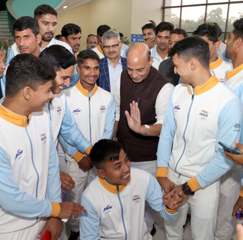 एशियाड-2023 पदक विजेता सैन्य कर्मियों के साथ रक्षा मंत्री राजनाथ सिंह।