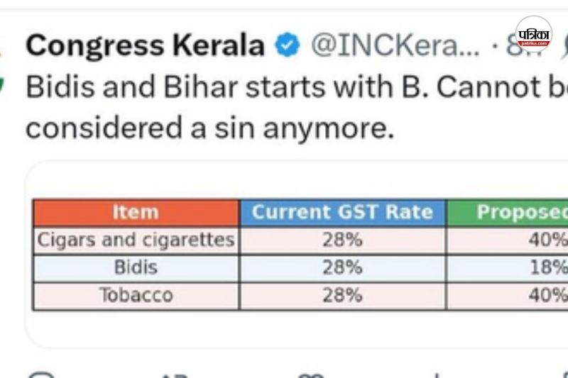 केरल कांग्रेस ने 'एक्स' पर पोस्ट कर कहा कि 'बीड़ी' और बिहार शब्द 'बी' से शुरू होते हैं। अब इसे पाप नहीं माना जा सकता। साथ ही उन्होंने जीएसटी का स्लैब भी शेयर किया, जिसमें तंबाकू, सिगार और सिगरेट पर जीएसटी 28 प्रतिशत से बढ़ाकर 40 प्रतिशत कर दिया गया है, जबकि बीडी पर टैक्स 28 प्रतिशत से घटाकर 18 प्रतिशत कर दिया गया है।