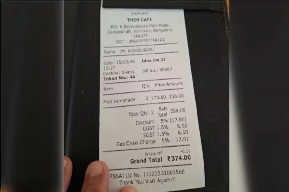 X पर एक पोस्ट में एक यूजर ने थियो कैफे की रसीद की तस्वीर साझा की। इसमें नजर आ रहा है कि 179 रुपये प्रति बोतल की कीमत वाले दो मिंट लेमोनेड के ऑर्डर पर 17.01 रुपये का 5 प्रतिशत 'गैस संकट शुल्क' लगाया गया है। दोनों पेय पदार्थों की कुल कीमत 358 रुपये है।